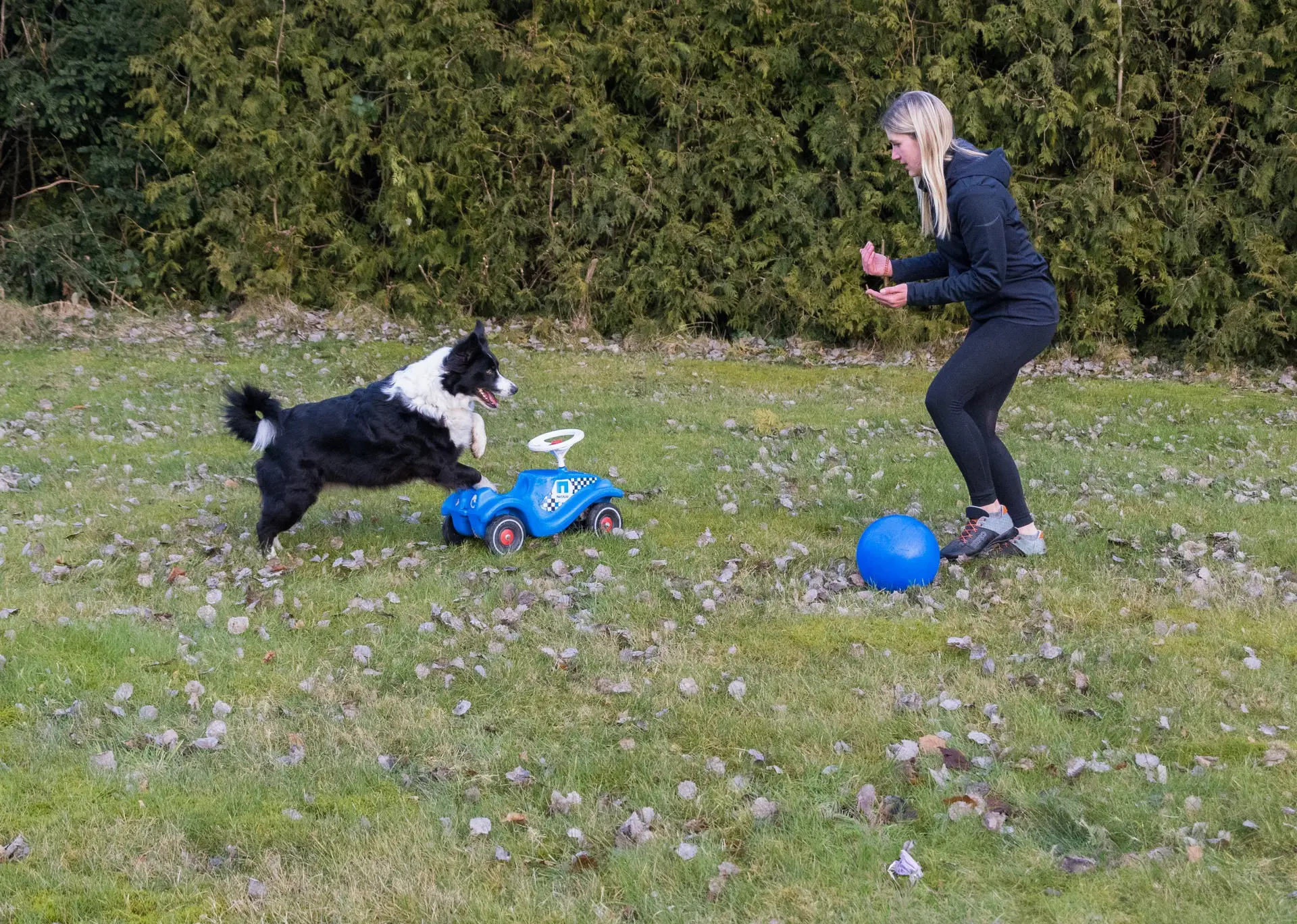 Actionreiches Training im Garten – Border Collie mit Spielzeug beim Hunde-Shooting in Großheide.