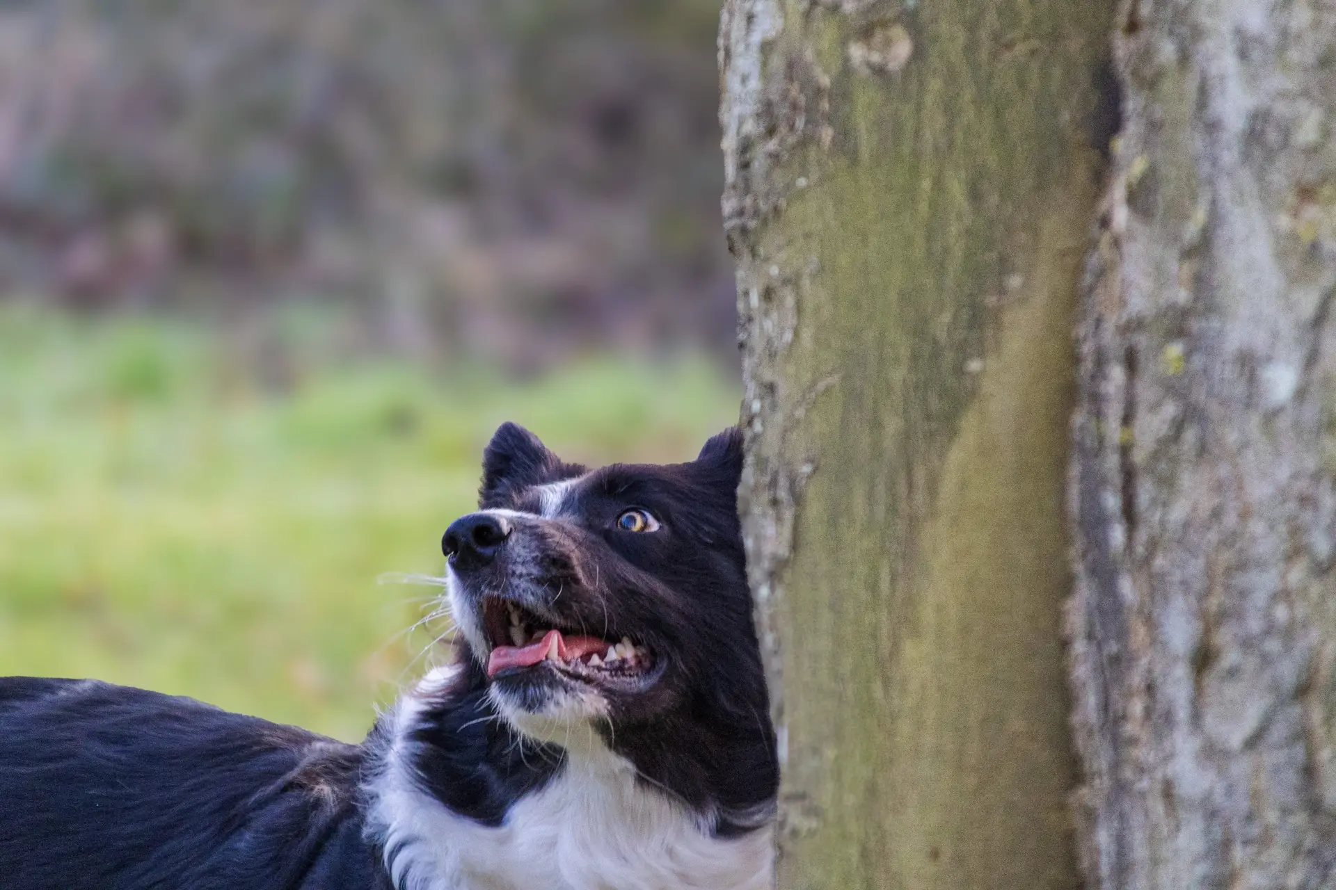 Ein neugieriger Hund schaut hinter einem Baum hervor. Authentisches Hundefoto von Anke’s Fotoshooting in Großheide.